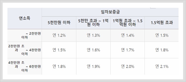 신혼부부 전세자금 대출에 경우에는 다른 대출상품보다는 대출자의 소득과 보증금에 따라서 조금식에 차이는 발생을 하겠지만 평균적으로 연 1.2~2.1% 사이로 매우 저렴한 금리로 대출을 받을 수 있습니다.